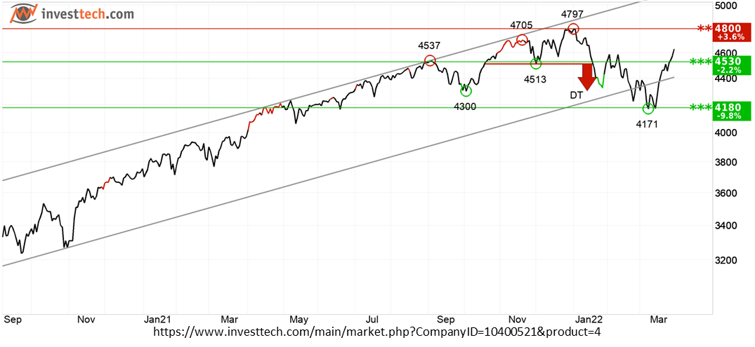 지수는 4530 지점에서 지지선과 4800 지점에서 저항선 사이에 있음