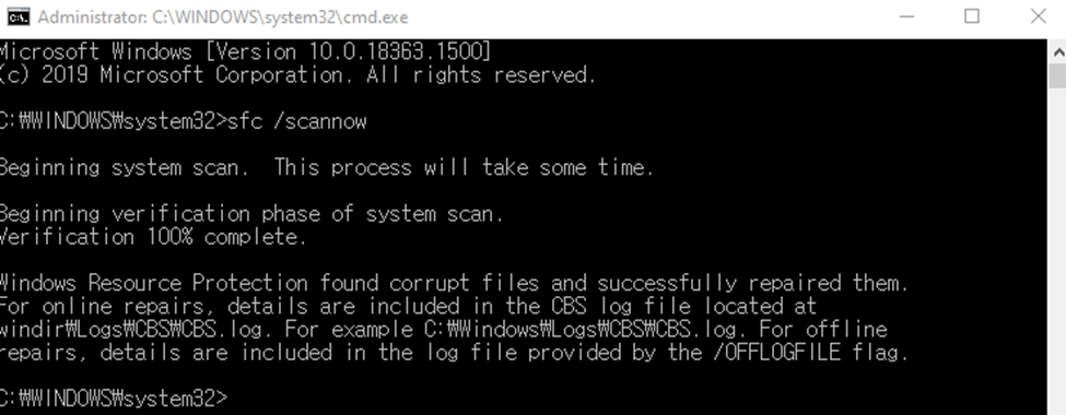 sfc /scannow 실행이 끝나면 다음 결과 창이 나옵니다.