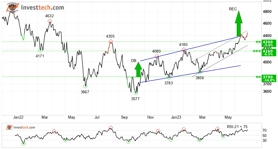 다음은 investtech에서 가져온 현재 (7/3/2023) S&P 500 차트 분석 예입니다.