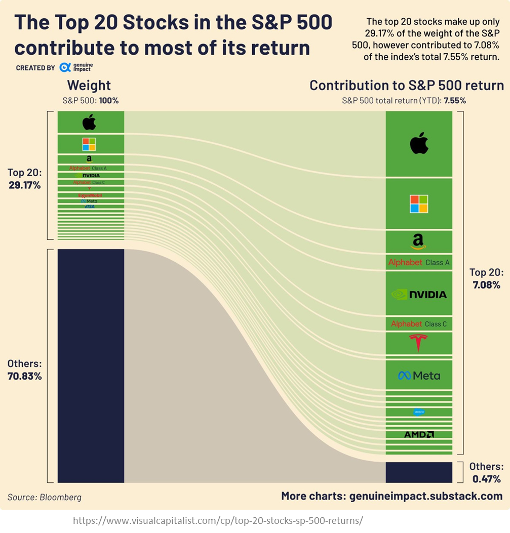 소수의 기업들이 S&P 500 지수를 주도하고 있다는 것을 알 수 있습니다.