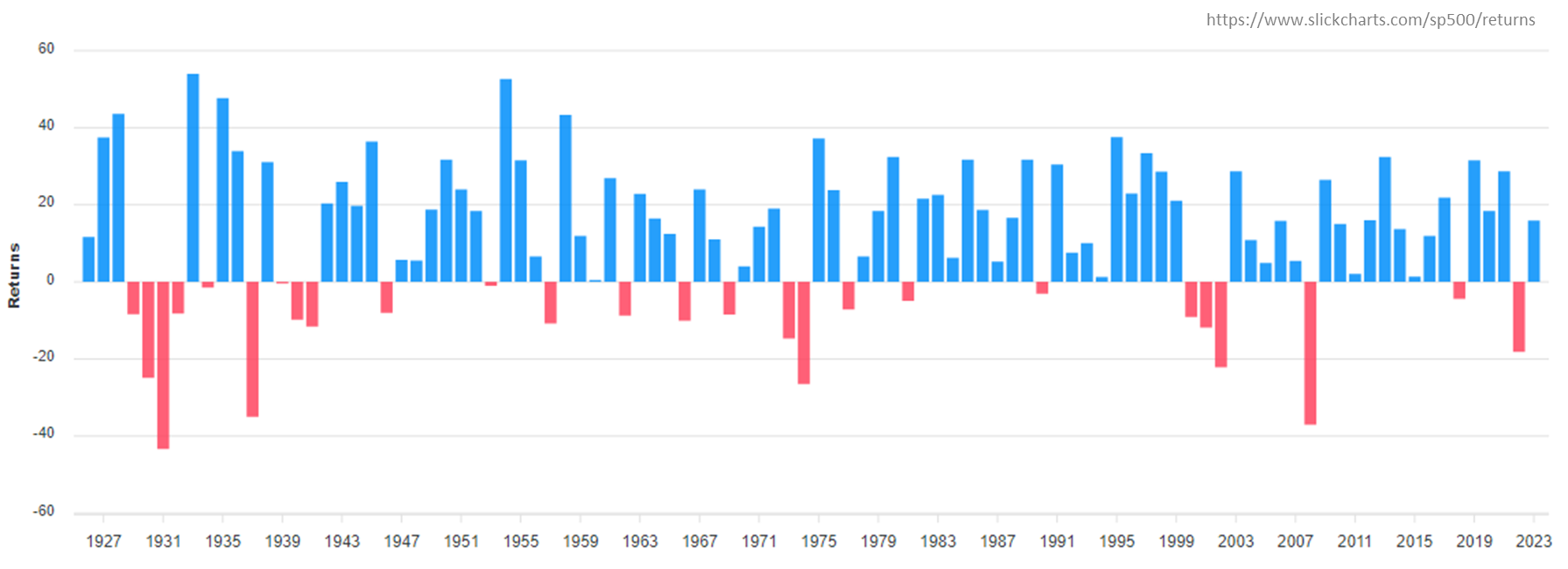 아래는 S&P 500 지수의 연간 실적입니다.