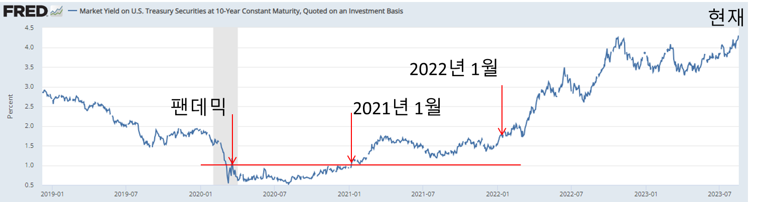위 그래프를 보면 10년 만기 국채 수익률이 팬데믹에 급격히 상승하였고