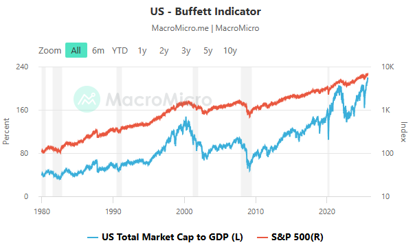 9월, 투자자들 사이에서 다시 한 번 경고음이 울리고 있습니다. 바로 ‘버핏 지표(Buffett Indicator)’가 사상 최고치인 218%를 기록했기 때문이에요. 이 지표는 미국 전체 상장기업의 시가총액(Wilshire 5000 지수)과 국내총생산(GNP)을 비교한 비율로, 워런 버핏이 “가장 신뢰할 수 있는 시장 밸류에이션 지표”라고 언급하면서 유명해졌습니다.