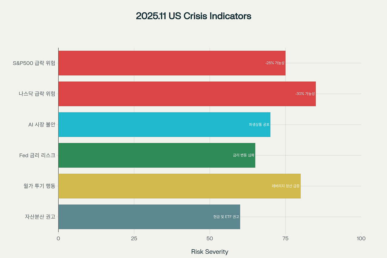 - S&P500, 나스닥, 다우 등 주요 지수들이 급락 전환 가능성(예상 -26~30%) 경고. 10월~11월 급등 후, AI·테크에 집중된 랠리 피로가 고조.