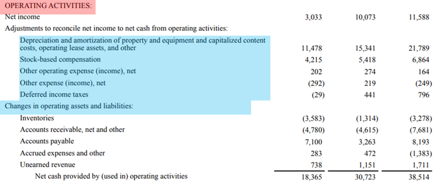 Depreciation and amortization of property and equipment (자산 및 장비의 감가상각비) : 자산 (예 : 공장 장비)의 소모를 나타내는 비 현금 비용으로 순 현금 (net cash)에 추가.
