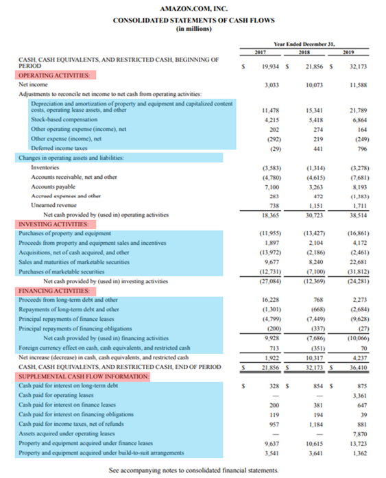 다음은 Amazon (NASDAQ : AMZN) 은 연간 10K 보고서에서 발췌한 현금 흐름표입니다.