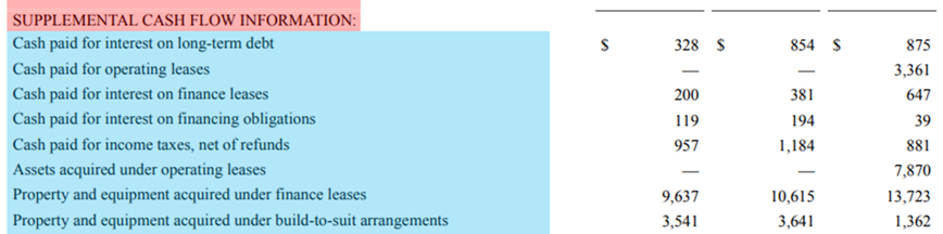 Cash paid for interest on capital and finance lease obligations (자본 및 금융리스 의무에 대한이자 지급 현금) : 자본 및 금융리스 의무에서 누적이자를 지불하기 위한 현금 사용.