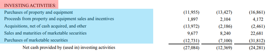 Proceeds from property and equipment sales and incentives (자산 및 장비 인센티브로 진행) : 아마존의 자산 및 장비 구매에 대한 추가 정보를 위해 추가된 항목입니다. 부동산 및 장비 공급 업체로부터 받은 인센티브는 아마존 비용 절감 및 현금 사용 감소로 기록됩니다.