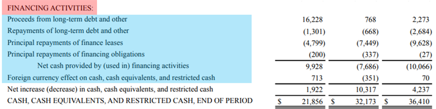 Proceeds from long-term debt and other (수익금 장기 부채 및 기타) : 장기 부채를 발행하여 자본을 조달하여 얻은 현금. 순 현금에 추가.