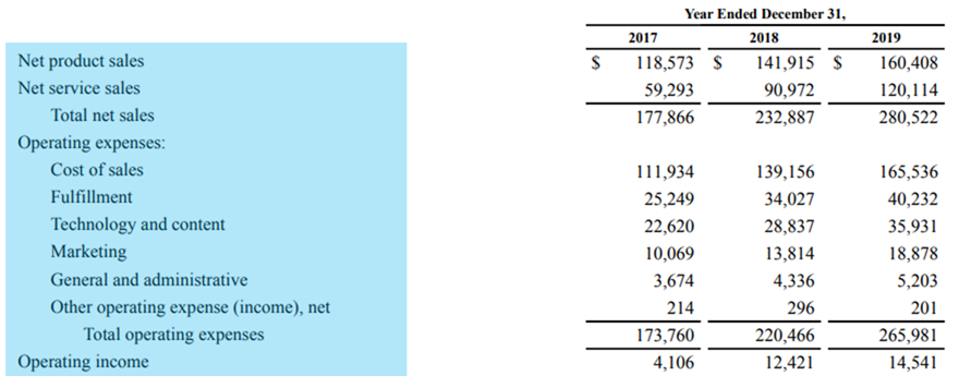 Marketing (마케팅) :아마존 및 그 제품 및 서비스에 대한 광고 및 마케팅에 관련된 비용. 마케팅 비용은 종종 판매, 일반 및 관리 비용으로 그룹화되지만 Amazon은이를 자체 광고 항목으로 분류합니다.