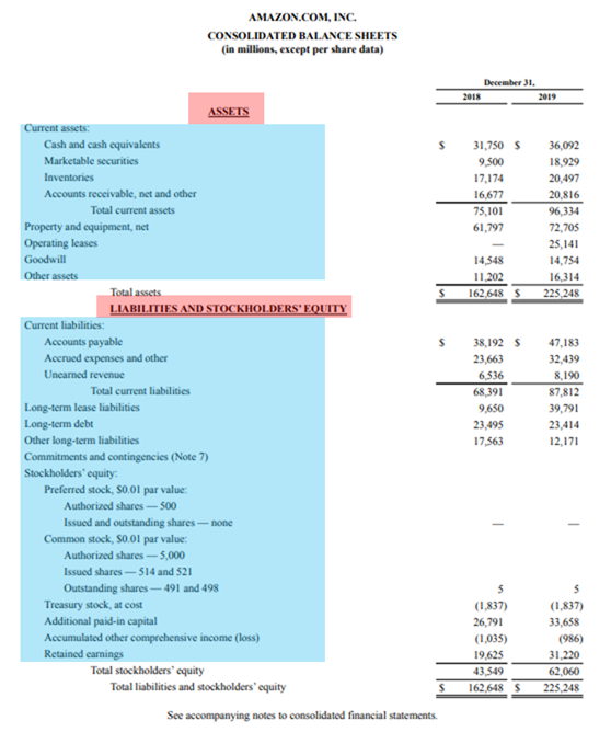 예제로 Amazon.com, Inc. 의 2019년 재무제표를 사용하여 재무제표 각 항목들을 자세히 살펴보겠습니다. 링크 참조.