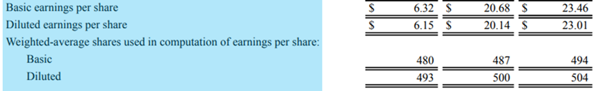 Weighted-average shares used in the computation of earnings per share (주당 수입 계산에 사용되는 가중 평균 주식) : 연중 새로운 주식 발행을 설명하기 위한 가중 평균 주식 수. 이 계산이 작동하는 방식은 해당 회계 기간에 따라 연중 가중 평균 주식 수를 계산하는 것입니다.