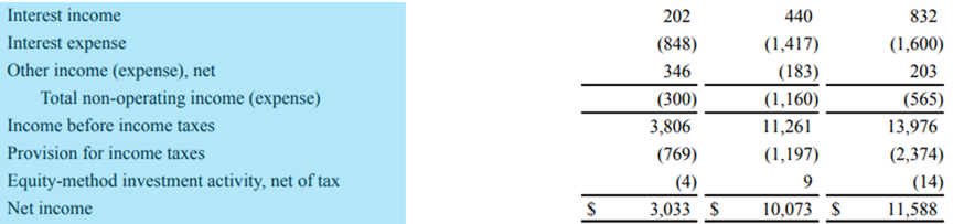 Income before income taxes (소득세 전 소득) : 운영 및 이자 비용을 제외한 아마존의 소득.