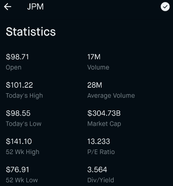 조금 알기 쉽게 지금 사용 중인 Robinhood 앱에서 요즘 관심을 갖고 있는 회사인 JPMorgan Chase & Co. NYSE: JPM을 캡처한 그림을 예로 사용해보겠습니다.