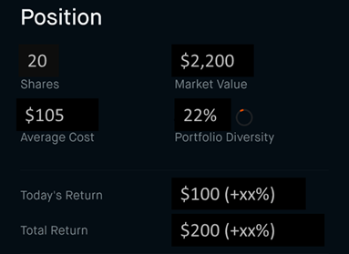 원래 주식을 매수하게 되면 Position이라는 란이 있고 그 아래에 Shares, Average Cost, Market Value, Portfolio Diversity, Today’s Return, Total Return 이 나와 있습니다. 따로 설명이 필요 없는 비교적 간단한 용어들입니다.