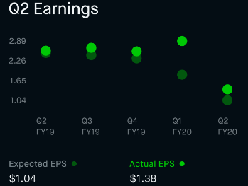 Robinhood 앱에서는 분기별 예상 EPS (Expected EPS)와 실제 EPS (actual EPS)를 제공합니다. 가끔은 EPS가 계산되지 않은 회사도 있습니다. 이러한 회사는 현재 수익이 나지 않고 있으며 투자를 하고 있는 회사들이 주로 해당됩니다.